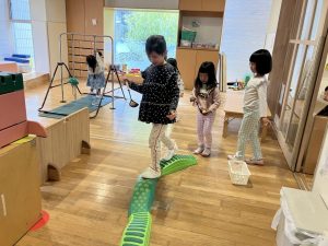 くぐり抜けやピンポン玉をお玉に乗せる等のプレイデイでしたことを設置しました。くぐり抜けではどのように体を動かすのか、どこに力を入れたらいいかと難しい様子のちゅーりっぷ組さん。何回もすることで分かるようになり、ひとりでできるようになっていました。