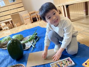 礼拝の後は絵画造形遊び。すぐに絵を描きだすのではなく、朝のようにまずは触れたり匂いを嗅いでみることから始める子が多くいました。「同じカボチャでも色や大きさが違うのはなんで?」「いい匂いだね」「なんで野菜は青色がないんだろう?(鋭いですね!)」と野菜の新たな発見をしていました。キャベツや白菜は緑というイメージがありますが、細かく見てみると「黄色」「白色」「黄緑」が混ざり合ってできていることにも気がついていました。細かいところに気がついたこともあり、今日の描画では色も細かに塗る姿がありました。野菜の形を見て描くだけでなく、野菜を段ボールの上に置いて直接形をなぞる方法も見つけていましたよ。