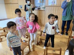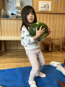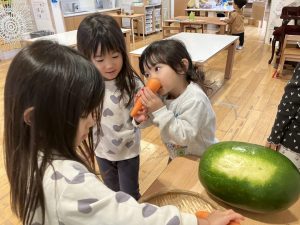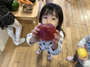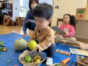 今日は収穫感謝です。秋の実りだけでなく、普段私たちが口にしているお野菜や果物は神さまが作ってくださったものですね。食べられることに感謝をしながら、食事を楽しみたいと思います。スーパーでは見ることの少ない大きなお野菜たちに興味津々な子どもたち。見る、触れる、匂いを嗅いでいました。