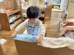 くぐり抜けやピンポン玉をお玉に乗せる等のプレイデイでしたことを設置しました。くぐり抜けではどのように体を動かすのか、どこに力を入れたらいいかと難しい様子のちゅーりっぷ組さん。何回もすることで分かるようになり、ひとりでできるようになっていました。