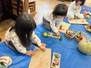 礼拝の後は絵画造形遊び。すぐに絵を描きだすのではなく、朝のようにまずは触れたり匂いを嗅いでみることから始める子が多くいました。「同じカボチャでも色や大きさが違うのはなんで?」「いい匂いだね」「なんで野菜は青色がないんだろう?(鋭いですね!)」と野菜の新たな発見をしていました。キャベツや白菜は緑というイメージがありますが、細かく見てみると「黄色」「白色」「黄緑」が混ざり合ってできていることにも気がついていました。細かいところに気がついたこともあり、今日の描画では色も細かに塗る姿がありました。野菜の形を見て描くだけでなく、野菜を段ボールの上に置いて直接形をなぞる方法も見つけていましたよ。