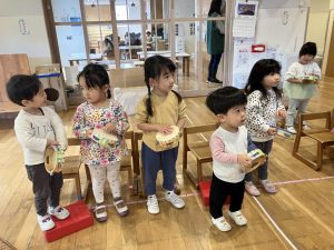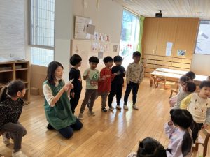 ↑自分の番の時はリズムに合わせて楽器を鳴らし、自分の番でない時は音を立てないように待ちます。何回か繰り返しているうちに流れを理解し、保育士の指差す合図を見て行うようになっていました。リズムに合わせる感覚も養っていきたいところです!