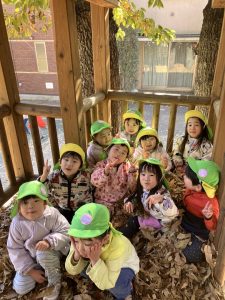 ↑「プールつくるの!」とお友だちとせっせと落ち葉をツリーハウスに運び、帰り間際になんとか完成!記念に写真を撮りました☺(岩口、中山)