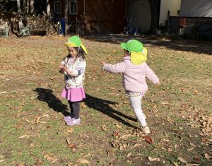 グラウンドでの鬼ごっこ、今日はロボット鬼・リンゴ鬼を楽しんでいました。