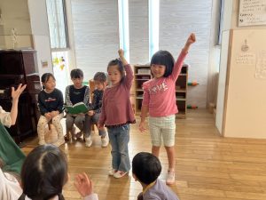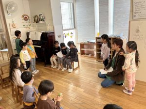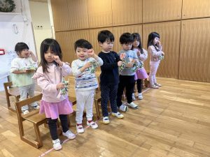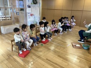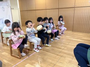 ↑自分の番の時はリズムに合わせて楽器を鳴らし、自分の番でない時は音を立てないように待ちます。何回か繰り返しているうちに流れを理解し、保育士の指差す合図を見て行うようになっていました。リズムに合わせる感覚も養っていきたいところです!