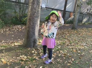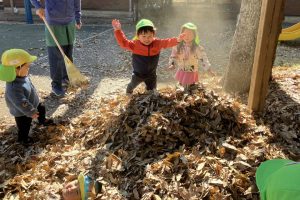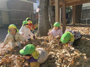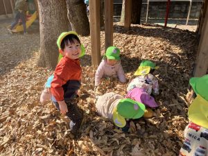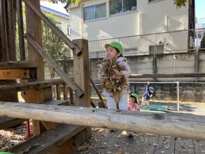 ↑「プールつくるの!」とお友だちとせっせと落ち葉をツリーハウスに運び、帰り間際になんとか完成!記念に写真を撮りました☺(岩口、中山)