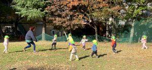 グラウンドでの鬼ごっこ、今日はロボット鬼・リンゴ鬼を楽しんでいました。