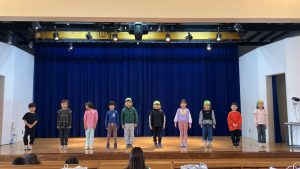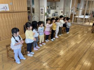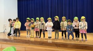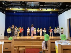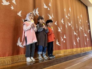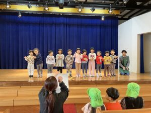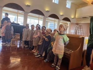 イエス様のお誕生を楽しくお祝いする祝会では、異年齢グループでの楽器演奏とクラスで歌うことを行います。ちゅーりっぷ組が歌う曲は『海と空作られた主』という讃美歌です。初めて舞台に上がってやってみましたが、並ぶことからお辞儀・歌と一生懸命頑張っていましたよ。可愛らしい姿楽しみにしていてください。