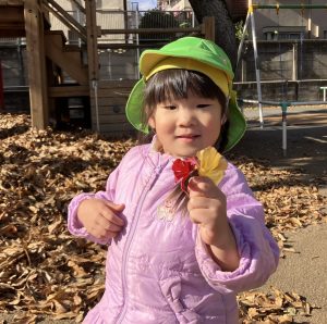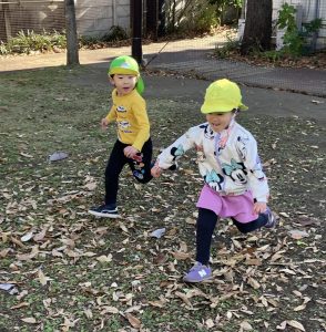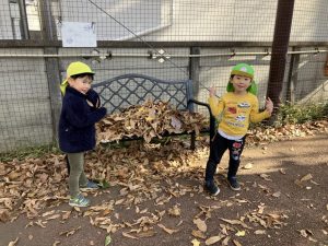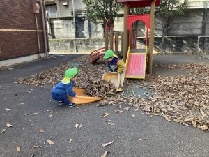 グラウンドには落ち葉がたーくさんあり、育成園の職員がほうきで集めていました。その様子を見てちりとりを担いお掃除に参加したり、「おべんとうなのー!」とベンチに集めたりして冬の自然を感じながら遊んでいましたよ。