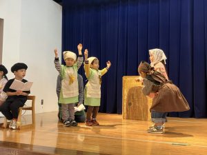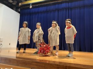 今日はページェント礼拝から祝会までの流れを一通り行ってみました。両クラス共にそれぞれのセリフの部分練習をしてきたこともあり、大きな声でセリフが言えるようになってきました。また、今日はお友だちのいいところ探しとして「どんな素敵な姿があったか?」聞いてみると「天使さんの小道具を持って手を挙げるのは疲れるけど頑張っていた」「セリフをみんなはきはき言えていた」と声が挙がりました。自分が頑張るだけでなく、お友だちの頑張っている姿にも目を向け見てみることも大切なことですね。どんな場面でもみんなで作り上げていることを感じてほしいなと思います。詳細はドキュメンテーションにも掲示いたしますね。