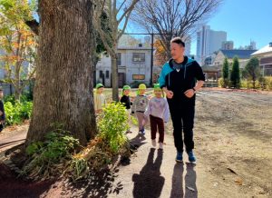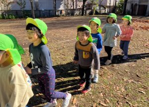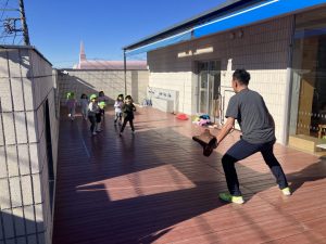 振り返りをした後は運動あそびをグラウンドでしました。最初はひろむ先生の後ろをついていくランニング。