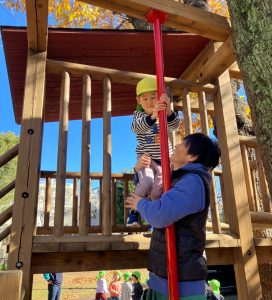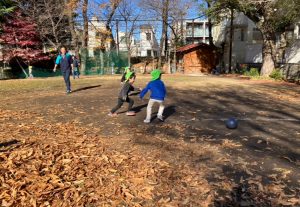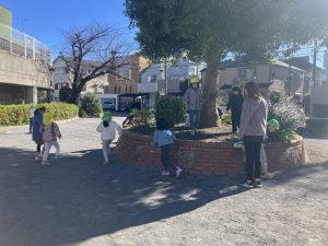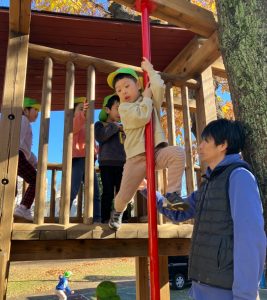 そのあとは弦巻遊び場で遊びました。以前交流したこともあり、今回は保育士が声をかける前に子どもたちで自然と鬼ごっこが始まっていました。子どものコミュニケーション力、すごいですね~。(石元)