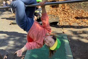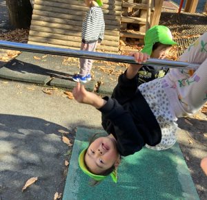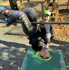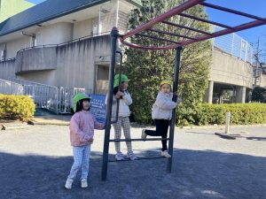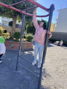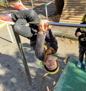 体がほぐれた後は鉄棒で「豚の丸焼きじゃんけん」をしました。豚の丸焼きをするのは簡単ですが、片手を離してなにかをするのは力がないとできません。「せんせい、てをおさえてて!」と手伝ってもらいながらじゃんけん。負けた後は「つぎはかつぞ!」と意気込んで挑む姿がありました。そのあとは一回だけ上り棒を降りました。