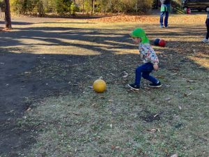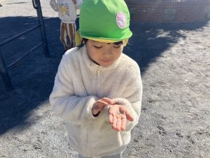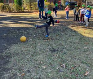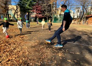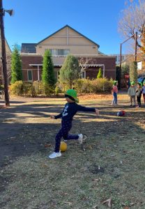 最後はボール蹴り。「まてまて!」と言わんばかりの元気に追いかける姿。思いっきり蹴るのですが、強く蹴れる時と蹴れない時があったりと面白さがありました。「ぼく、わたしがけれる!」のタイミングでお友だちに蹴られてしまったりと芝生全体を使い蹴り合いました。