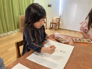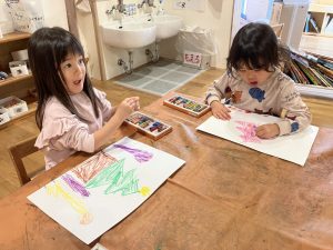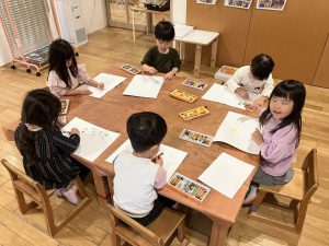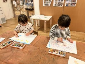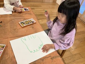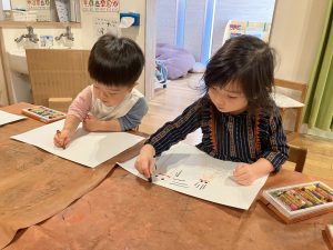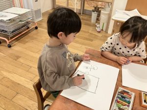 音楽あそび前後の時間は、クリスマス会で印象に残っていることを描いてみる活動を行いました。「ほし描きたい!」「こっちがパパでこっちがママ」「やどやさんしてるところ」と当日を思い浮かべながら描き始めていましたよ。描きたいイメージはあるけれど、自分では描けないかも…という子には、保育士が一緒に描いて子どもちが描けそうなところは委ねて進めました。お友だちや保育士を見て”わたしも描きたい!””こうやって描いてみよう!”と影響を受ける姿もありました。プリンセスやスーパーなどのイメージに広がる様子もありましが、この年齢らしいですね。それぞれ描きたいものを満足するまで描いた良い時間となりました。(岩口)