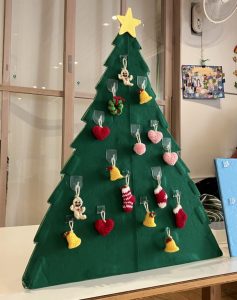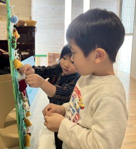 最後に『クリスマスの12にち』というイギリスの民謡に合わせて、クリスマスツリーを飾りつけました。