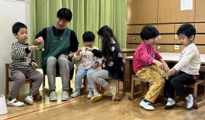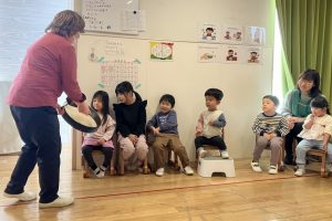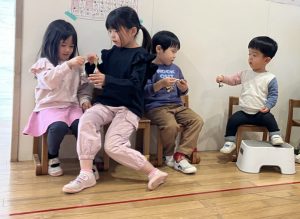 ハッピーベルは、ひとつでは音を鳴らすことができないので、お隣のお友だちとベルを合わせ、音を奏でました♩はじめは、音が鳴るおもしろさ、楽しさでいっぱいのようでしたが、次第に桃原先生のピアノの音、歌を聞き、リズムに合わせて鳴らす姿がありました。