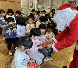 サンタさんが他のところへ出かけて行ったあとも、「来てくれてうれしかったね!」「(すみれ、たんぽぽのお友だちに)サンタさん来たんだよ!!」と笑顔で話していた子どもたちでした。クリスマスは喜びでいっぱいになりますね。
