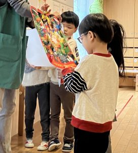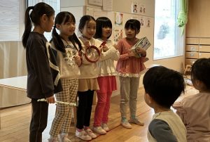 昨日は空き箱などを使って楽器をつくり、てづくりの楽器を演奏をしながらクリスマスの歌をうたっていた子もいました♩ぜひ、みんなの前でも演奏をしたいということで、朝の会のときに披露してくれました。『ジングルベル』、『あわてんぼうのサンタクロース』を歌い、クリスマスの朝を迎えました。楽しい、嬉しい気分ですね!