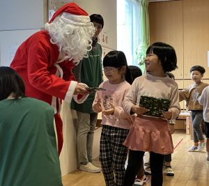 サンタさんとあいさつをし、サンタさんとお話をすることもできました。オリービア保育園の子どもたちの明るい声を聞き、プレゼントを届けに来てくれたとのことで、一人ひとり受け取りました♩