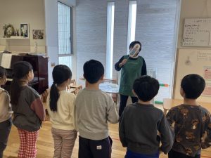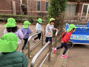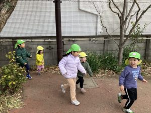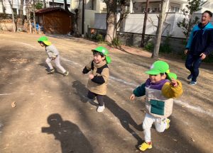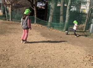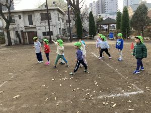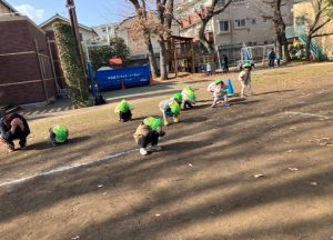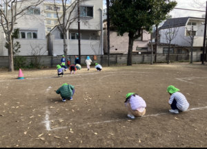 続いてだるまさんが転んだ。鬼が見ていたら止まる・しゃがんで顔を隠す・しゃがんで背中を向けるなど、いくつかの進み方をしました。