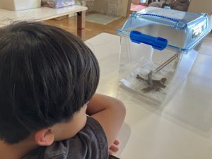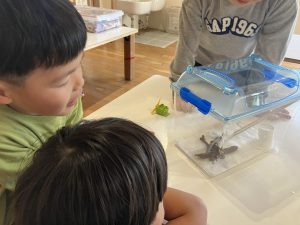 運動あそび前は自由遊びをしていましたが、その間もヤモリの観察をする子もいました。ちょうど、コオロギを食べる瞬間を目の当たりにすることができ、「餌食べたー!」と周りの子に伝えに行っていました。「餌食べたから元気出るね」と喜んでいましたよ。