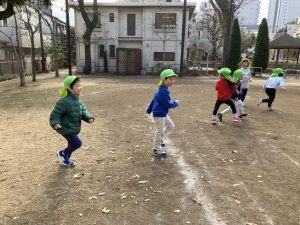 まずは体を温めるためにもランニング♪列になって前の人についていくように走りました。抜かさないように、前の人をたどるようについていきます。