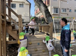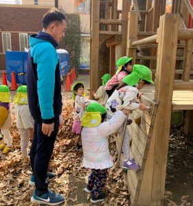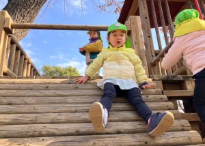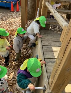 ツリーハウスを使っての運動。ロッククライミングをよじ登ってあがり、反対側のすべり台を降りてくることをしました。ツリーハウスが使えるようになってから、初めは怖い・手伝ってと言っていたロッククライミングでしたが、今では自分で捕まるところ・足を置くところをよく見て考え、できるようになりました。