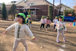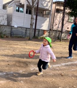 ウォーミングアップをした後は、バトンパスをして走ることをしてみました。この遊びにも乳児クラスのお友だちが混ざって、みんなでバトンを繋げました。「えっと~誰だっけ?」「次どこだ?」とパスする相手に迷ってしまう様子もありましたが(笑)、ひろむ先生が教えてくれたり、「こっちこっち!」と呼んでくれたりしたことで、無事繋がってたくさん走ることができましたよ。