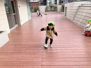 月曜日にひろむ先生と行ったボールを拾いに行く遊びをしました。保育士が投げたボールを子どもたちが拾いに行きます。その時は先に他の子がボールを取ったことで心が折れ涙する子が続出…(笑)今日は順番に行えるように調整して楽しみました。後半は子ども同士で投げる・取りに行くこともやってみましたよ。今日は気温が低かったですが、たくさん走り体が温まりました!