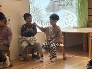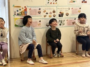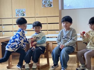 今日の音楽あそびは、2026年最初の音楽あそびということで、新年の挨拶をしてから始めました。朝の会の前に桃原先生に会ったときに「あけましておめでとうございます。」と挨拶をしていた子もいたようです。気持ちがいいですね!