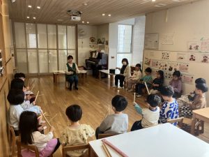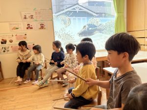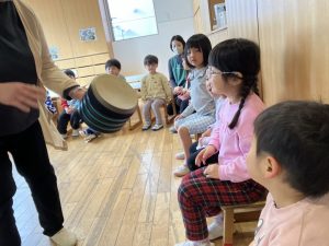 桃原先生が叩くトロムスの音に合わせてお餅つきもしました。みんなはドラムスティックを杵に見立て、音の強弱や様々なリズムを楽しみました。順に名前を呼ばれ、一人ずつ「はあい」と叩く場面でも、お友だちがどんな音を鳴らすかよく耳を傾けていましたよ。
