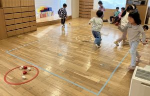 こちらは、グループ対抗で自分の陣地にボールを集める遊びです。白いボールは1点、赤いボールは2点という設定です。同じグループの友だちと、「赤いの集めて!」と声をかけあい、なるべく高い点を得られるようにしていました。