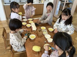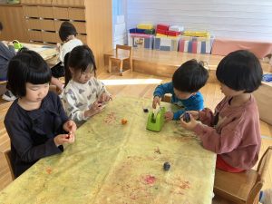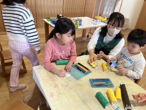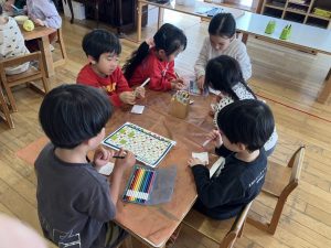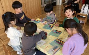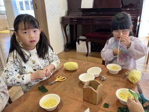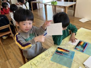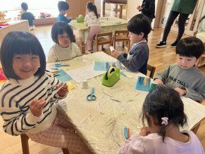 そのあとは気を取り直して、、!お楽しみ会の準備を行いました。各グループ「すみれさん、たんぽぽさん合わせて24人だよね!」「こんなのどう?」と先週話し合った内容を形にしていきました。作る過程では、お友だちと協力し、持つ人切る人と役割分担をしながら進める姿もありました。明日も準備を行う予定です。1階のドキュメンテーションも随時更新していきますのでご覧ください♩