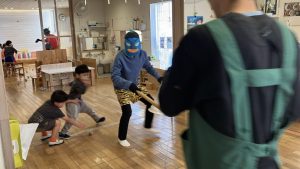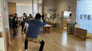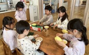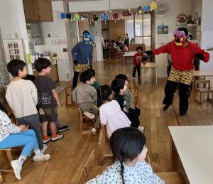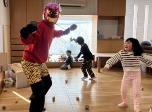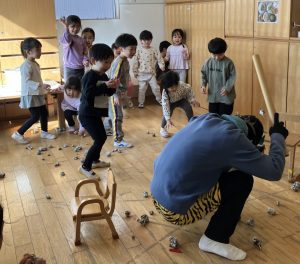 2月3日今日は節分ですね。昨日より鬼が来たときのために新聞紙で豆作りをしていました。今日の朝もひまわりさん中心に豆作りが行われ、各部屋のどこに置いたらいいか考えながら配置していましたよ。いつ来るかいつ来るかとどきどきな様子の子どもたち。ついにその時がやってきました。朝の会を始めていると扉が開きました…!怖い!と逃げる子、果敢に豆を投げる子、はたまた全く怖がらずに笑いながら近づくなど反応は様々でしたが、3クラス力を合わせて無事に鬼退治に成功しました。