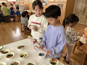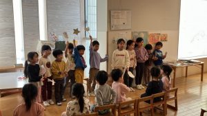 2025ちゅーりっぷ・ばら・ひまわり今日はおたのしみ会前、最後の準備の日。朝の会で各グループのできあがってきたものを紹介してから、それぞれの作業に移りました。