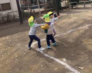 仲間がおににつかまったときに、自分の近くにおにがいるにも関わらず、恐れずに仲間を助けに行く姿がありました!たのもしい!遊びを通して助け合い、お友だちの力の大きさも感じられますね♪自然と「○○ちゃん!○○くん!たすけて!」と名前を呼び合っています。