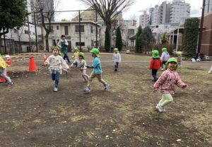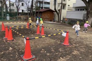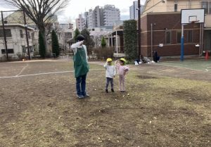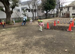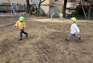 グラウンドチームは「ケイドロ」を目的に行きました。子どもたちは前にやったことがあるようで、ルールを説明すると「あ~あれね!」「こうだよね!」と聞いていました。最初は先生が「警察」子どもが「泥棒」で始まりました。逃げれる範囲も狭いので泥棒の大渋滞で逃げ回ります。