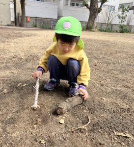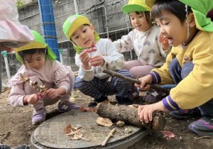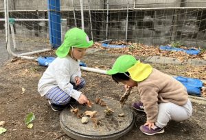 「ケイドロ」をしたあとは、ちゅーりっぷ組が「やきとりやさんごっこ」を始めました。木の串に葉っぱを刺してマンホールで焼きます。