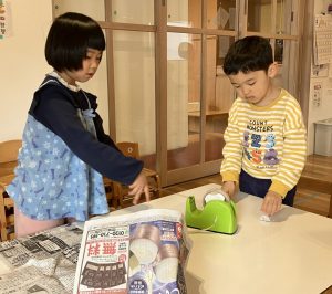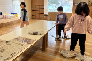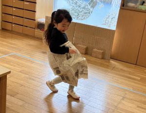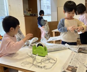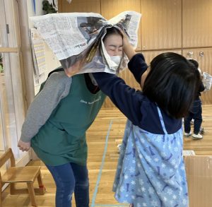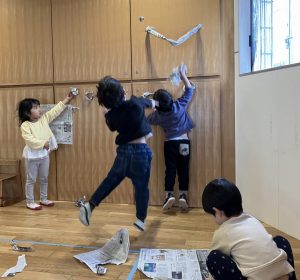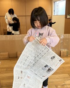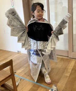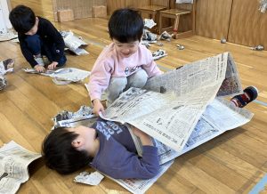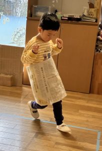 1枚の新聞紙が、子どもたちのアイデアによって、様々な形に変化し、遊びに広がりました。子どもたちの力はすばらしいですね!
