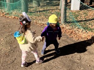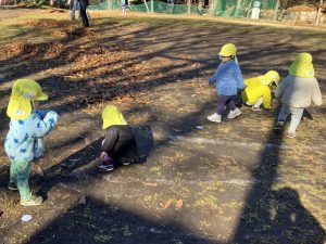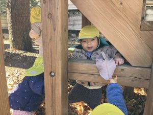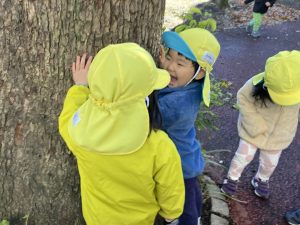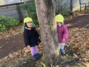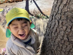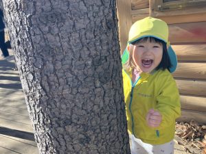 かくれんぼでは「もういいかい?」「まーだだよ!」「もういいかーい!」「もういいよー!」と、子どもたちからやりとりを楽しむ姿がありました。木の影がみんなのお気に入りの隠れるスポットです😊「見ーつけた!」「見つかっちゃった~!」の瞬間、いつもみんな良い笑顔です😊