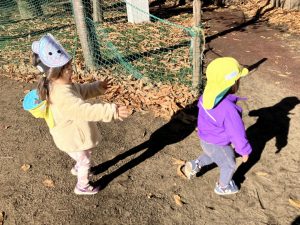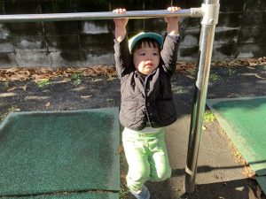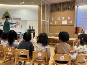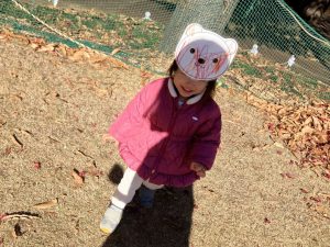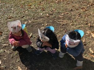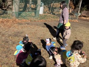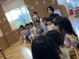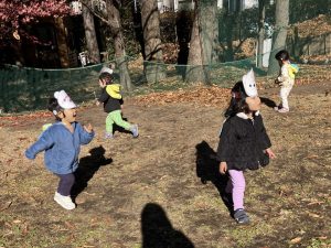 むっくりくまさんでは、くまさんと逃げる人に分かれて楽しみました。追いかけること、逃げることを楽しみ、だんだんと走っている時間も長くなってきています。思い切り走って元気いっぱい体を動かしました。