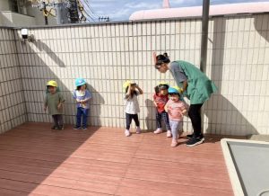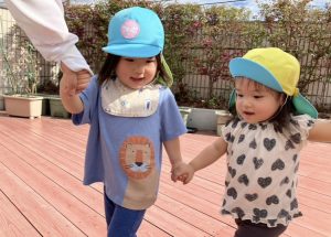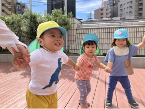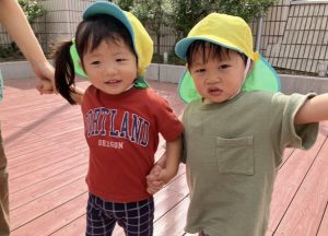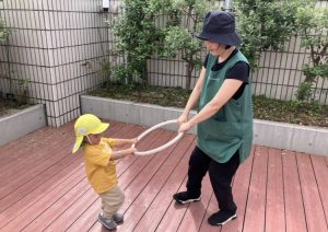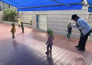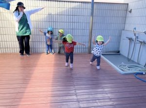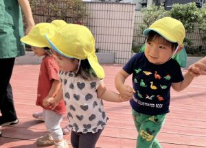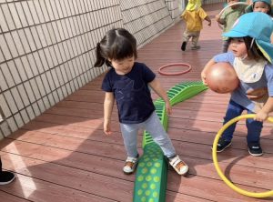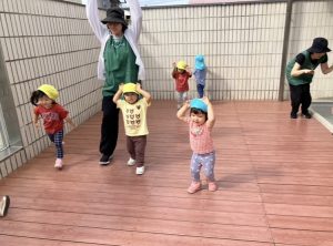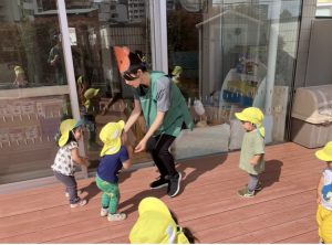 今日はウッドデッキへ。変身かけっこで動物や乗り物になって走ったり、