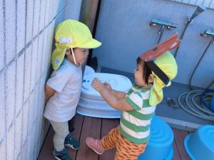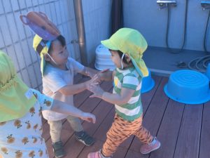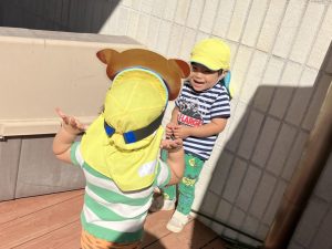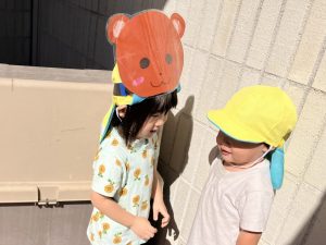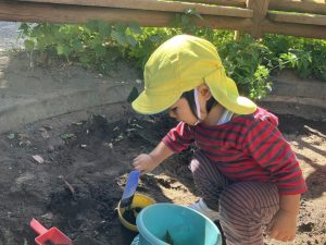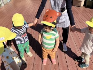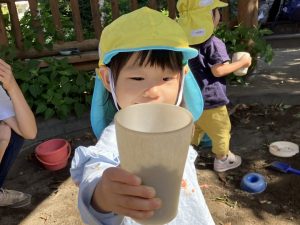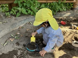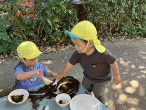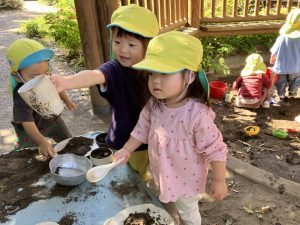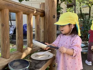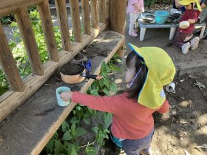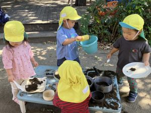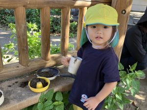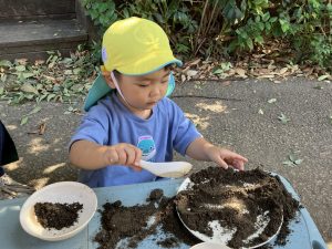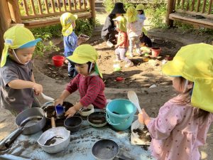 2025/10/10「今日の様子」 2025すみれ 2025.10.10 今日は砂場チームとデッキチームに分かれて過ごしました。 砂場ではごはんづくりを楽しんでいましたよ☺ デッキではむっくりくまさんのくまさん役にも挑戦しました!(嶋田・中村・谷口・切田)