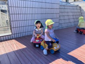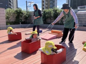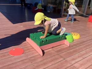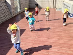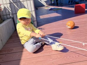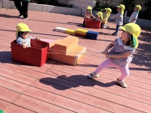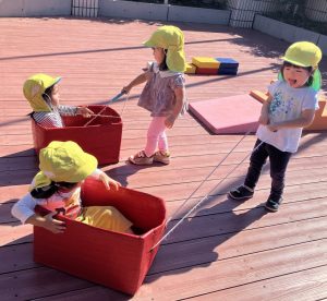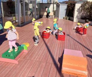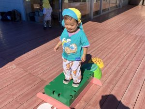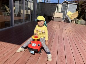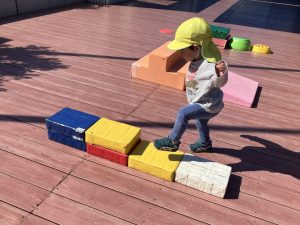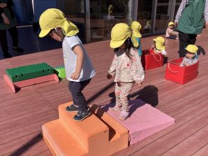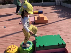 2025/10/17「今日の様子」 2025すみれ 2025.10.17 今日はウッドデッキで遊びました。プレイデイに向けて、段ボール電車や昇降台、巧技台からのジャンプを思い切り楽しみました。自分で好きなコースを選び、挑戦しました😊 (嶋田、藤原、中村、切田)