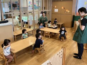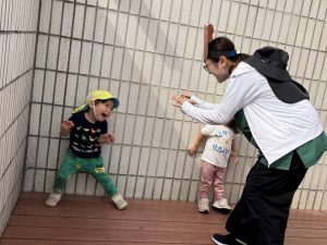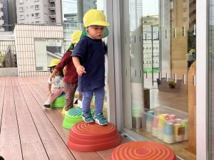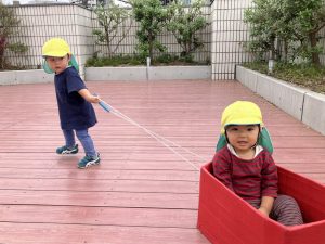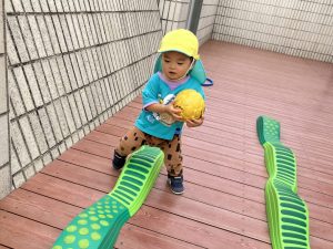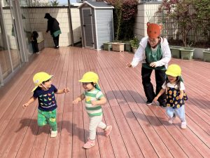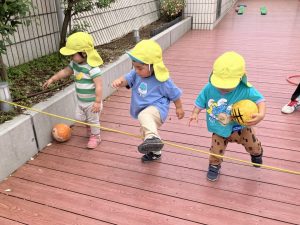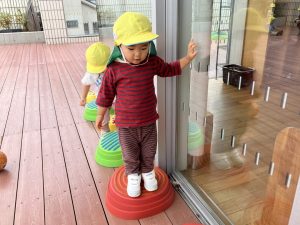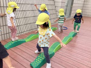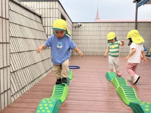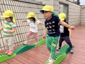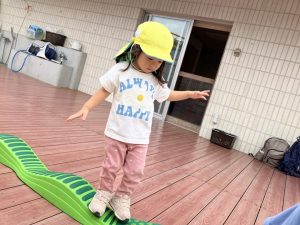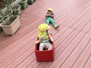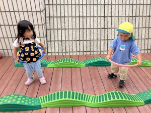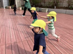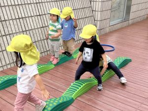 今日はデッキであそびました。変身かけっこ、むっくりくまさん、一本橋、大繩跳びなどをして思い切り体を動かしました。初めて行ったむっくりくまさんもとても楽しんでいました😊