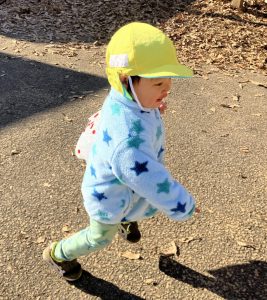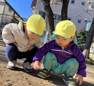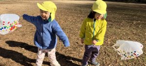 「手をあげてごらん!スーパーマンのポーズだよ」と伝えるとみんな頑張って腕を上げ走ってくれました!たくさん走り「ふぅー」と休憩する子も。自分で上げることを楽しむだけでなくお友だちの凧が空に上がっている様子も面白そうに見る姿がありました。