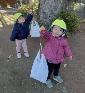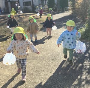 お正月あそびの凧揚げを初めてしました。凧は思い思いにシール貼りをした可愛らしい凧になっています☺