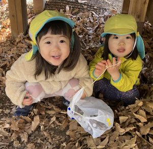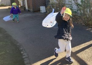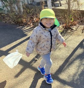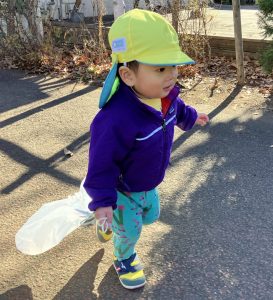 「手をあげてごらん!スーパーマンのポーズだよ」と伝えるとみんな頑張って腕を上げ走ってくれました!たくさん走り「ふぅー」と休憩する子も。自分で上げることを楽しむだけでなくお友だちの凧が空に上がっている様子も面白そうに見る姿がありました。