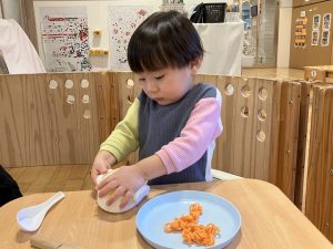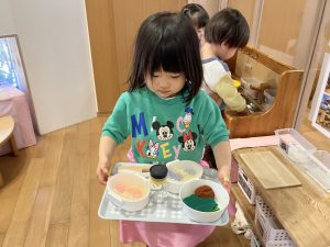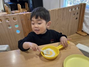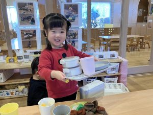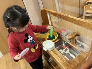 キッチンに立って「やきにく」と言ってお料理をしたり、お店屋さんのようにトレーにご飯を乗せて運ぶのを楽しむ姿がありましたよ☺